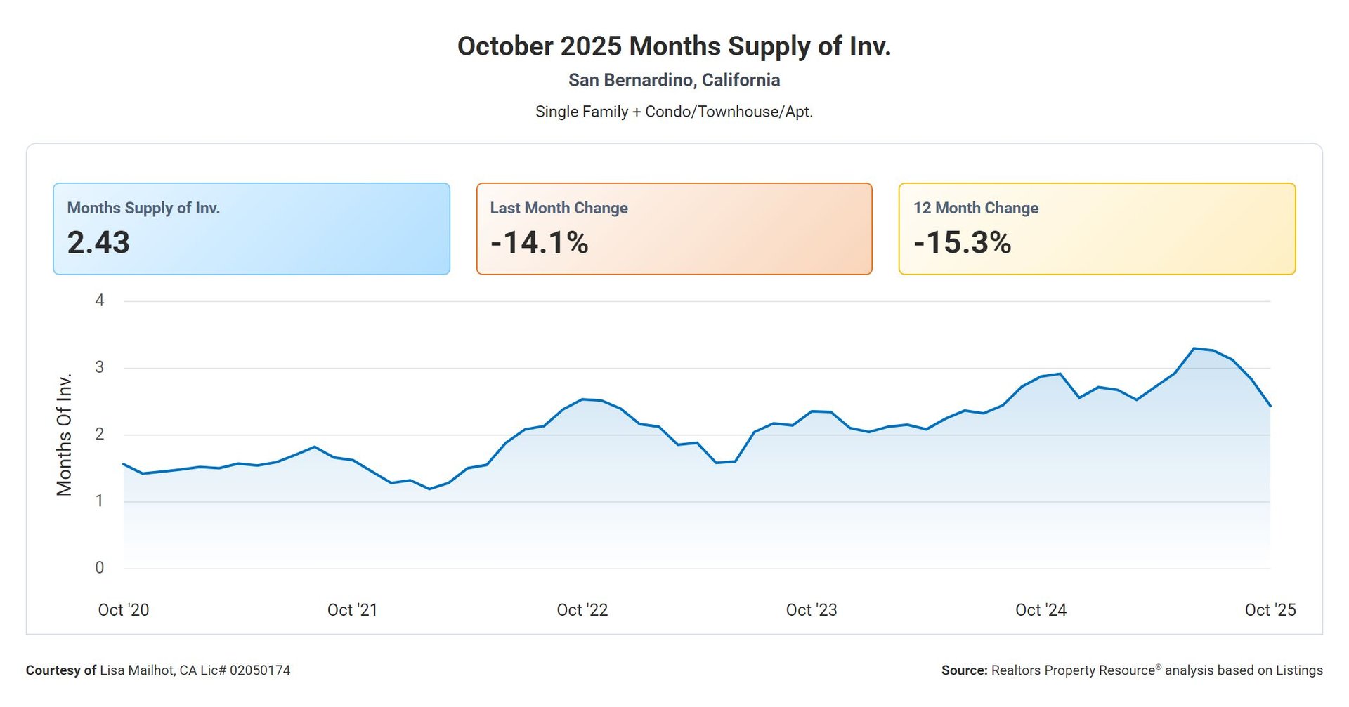 San Bernardino's housing market continues to be defined by tight inventory, with only 2.43 months of supply. This represents a 14% decrease from last month and a 15% decline year-over-year, creating a strong seller's market where demand consistently outpaces supply. The limited availability has intensified competition and accelerated the sales process.