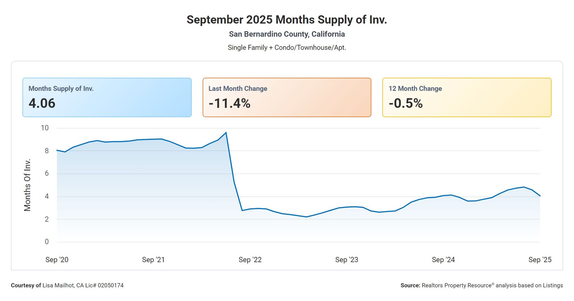 San Bernardino County presents a stable yet slightly seller-favored market, with a 4.06-month supply of inventory. Although inventory has decreased by 11% from last month, it remains unchanged year-over-year, signaling consistent market conditions.